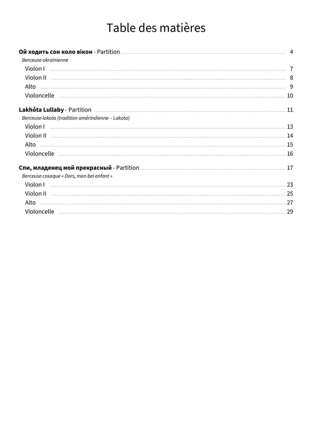 « Trois berceuses du monde » – trois berceuses de cultures lointaines, arrangées avec amour pour quatuor, chaleureuses, intimes, prêtes à jouer, droit au cœur.