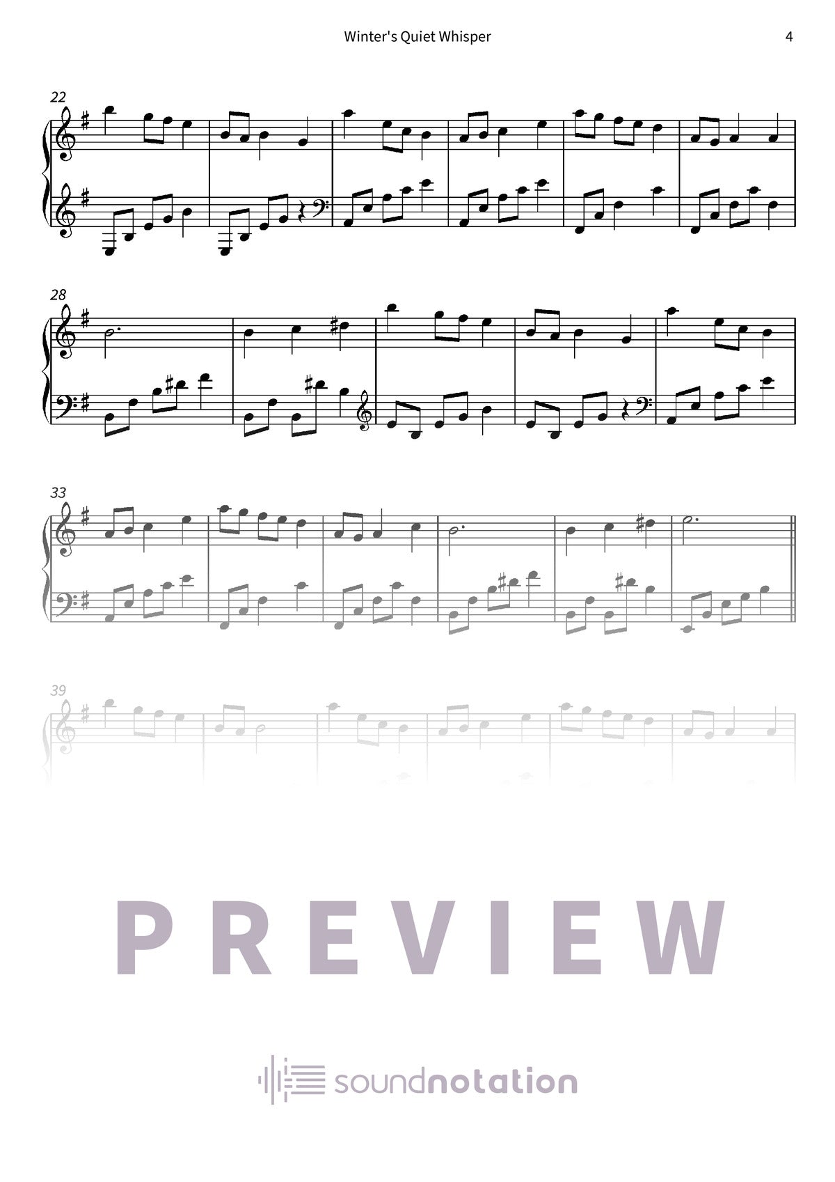 “Winter's Quiet Whisper” is a touching modern piano piece in E minor and gentle 3/4 waltz time (Andantino), capturing the stillness of a winter evening – like softly falling snow blanketing the world in gentle peace. With a playing time of around 4 minutes, it unfolds a melancholic yet warm soundscape of floating melodies and delicate arpeggios. Technically intermediate, melodically accessible, and highly rewarding to play – ideal for advanced pianists seeking emotional depth. Victoria Peckmann creates music that comforts and invites reflection. Perfect for quiet winter evenings, meditative moments, or as a poetic concert piece. A quiet whisper of winter that lingers long in the heart.