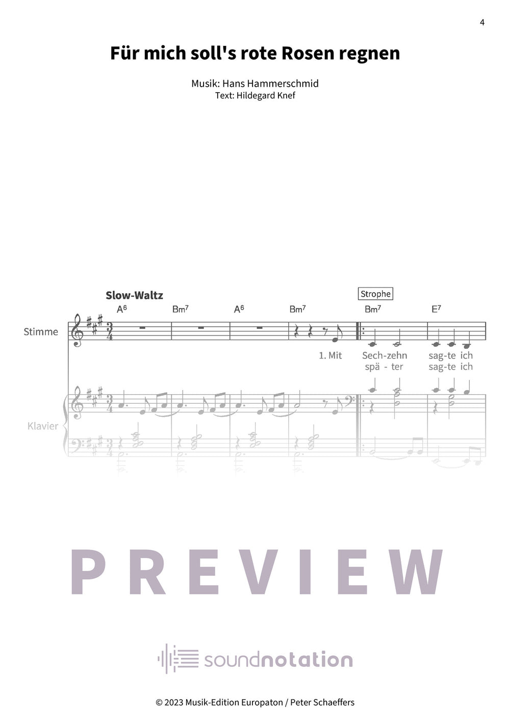 „Für mich soll's rote Rosen regnen" – Hildegard Knef, klar notiert für tiefe Stimme und Klavier, liegt gut in der Hand und lässt Raum für Ausdruck, mit Text und Akkorden.