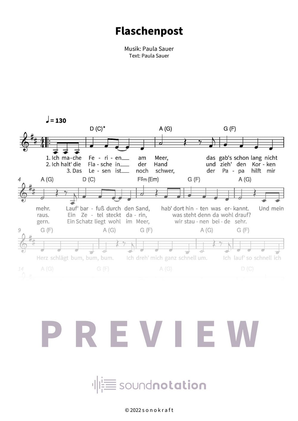 „Flaschenpost“ – Paula Sauers sommerlicher Kinder-Ohrwurm aus „Kleiner Sommer“: Leichtes Leadsheet D-Dur mit Lyrics, Akkorden & Melodie. Abenteuerliche Botschaft!