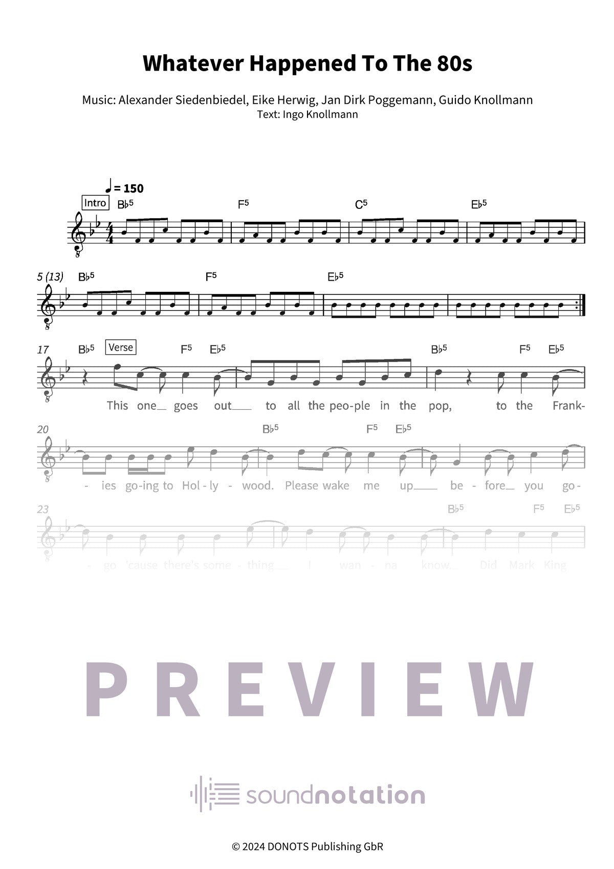 "Whatever Happened To The 80s" – Donots is a punchy, sing-along rock tune set in Bb major and moving in straight 4/4, and this easy lead sheet gets you to the heart of it without fuss. With lyrics and chord symbols included, it’s equally handy for guitar, piano, or quick band rehearsal when everyone just needs the roadmap. At about three and a half minutes, it feels like a tight set piece that doesn’t overstay its welcome, and the layout keeps things clear so you can focus on groove, cues, and the lift into the chorus. A version that delivers exactly what you’re looking for.