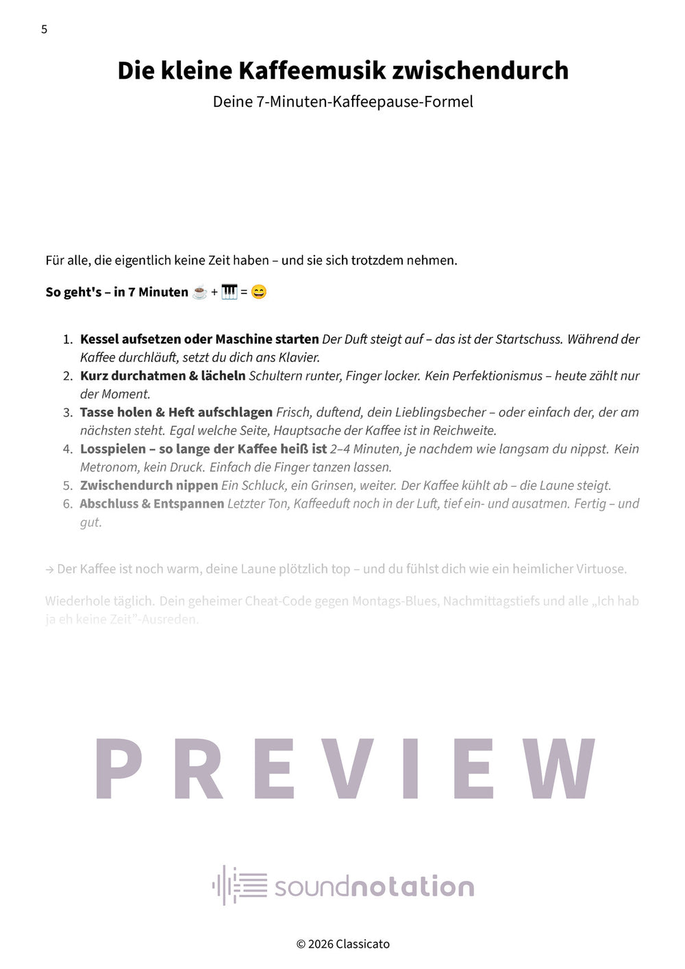 Fünf Minuten, eine Tasse Kaffee, fünf Meisterwerke von Debussy bis Scarlatti – sofort vom Blatt spielbar. Die perfekte musikalische Auszeit, die jeden Tag rettet.