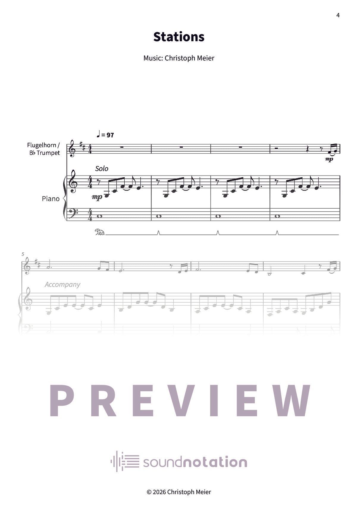 "Stations" is a focused, modern piece for flugelhorn and piano that balances lyric lines with a steady 4/4 pulse, so it feels grounded from the first bar. Written in C major, it sits comfortably on the horn and lets the piano support without getting in the way, which makes rehearsals efficient and musical. At an intermediate level, you’ll have enough detail to shape phrasing and dynamics, but the writing stays practical and reads cleanly, whether you’re sight-reading, polishing for a recital slot, or using it as a strong ensemble study. Take this version – it's exactly what you've been waiting for.